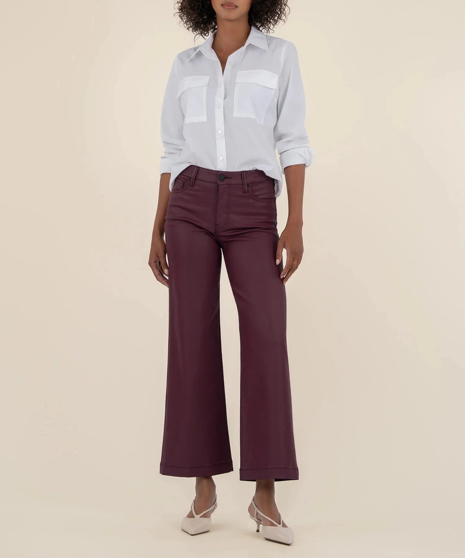 Make a statement with the Kut from the Kloth Meg High Rise Wide Leg jeans in Blackberry. Featuring coated fabric and ankle-grazing raw hems, these jeans provide a modern, flattering silhouette. The Fab Ab front pockets smooth and shape comfortably, while the long inseam and wide leg design add effortless style and movement. Crafted from a soft yet durable blend of modal, polyester, and lycra, they deliver both comfort and stretch for all-day wear.